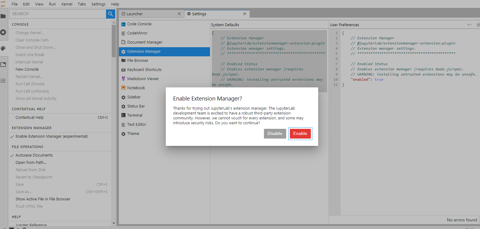 进入jupyterlab, 点击Settings->Advanced Settings Editor,将false改成true,可看到管理插件的界面,或者呢也可以命令行安装: