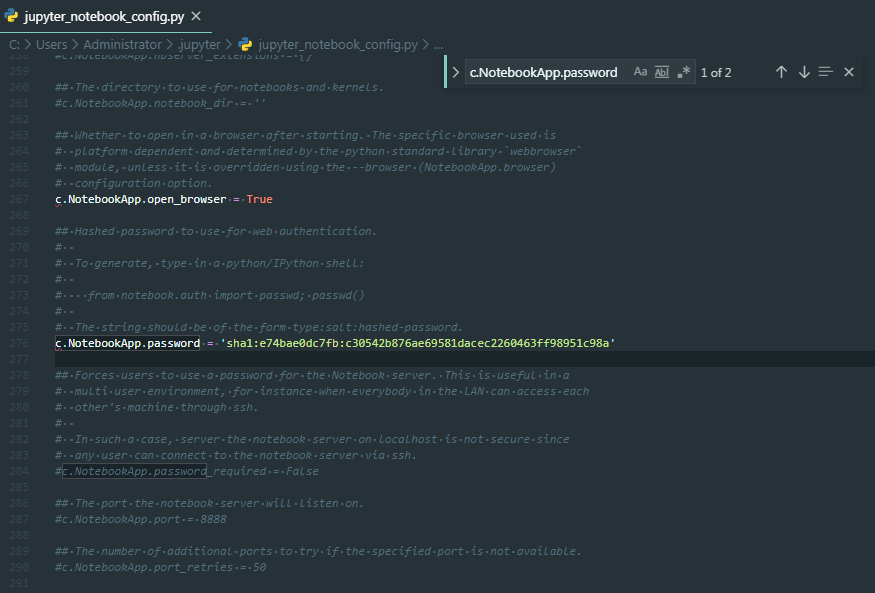 退出Ipython, 在终端打入jupyter lab --generate-config, 以我目前写这个文档的计算机为例,会显示Writing default config to: C:\Users\Administrator\.jupyter\jupyter_notebook_conf ig.py, 配置那个文件,一个密密麻麻的配置文件。